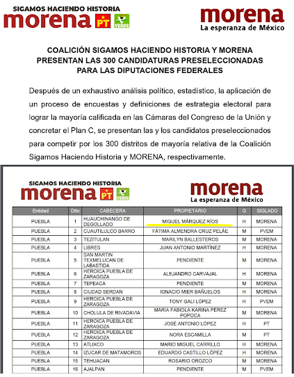 Quitan candidatura de Miguel Márquez Ríos, por no ser dama... Bueno, resulta que las cuentas no salieron bien. Entonces MORENA decidió como estaba, quitarle la candidatura al SME y pasársela a una señora desconocida de este Distrito de apellido vaquero SANTANDER… o si no queda nadie dársela a Lili Luna.